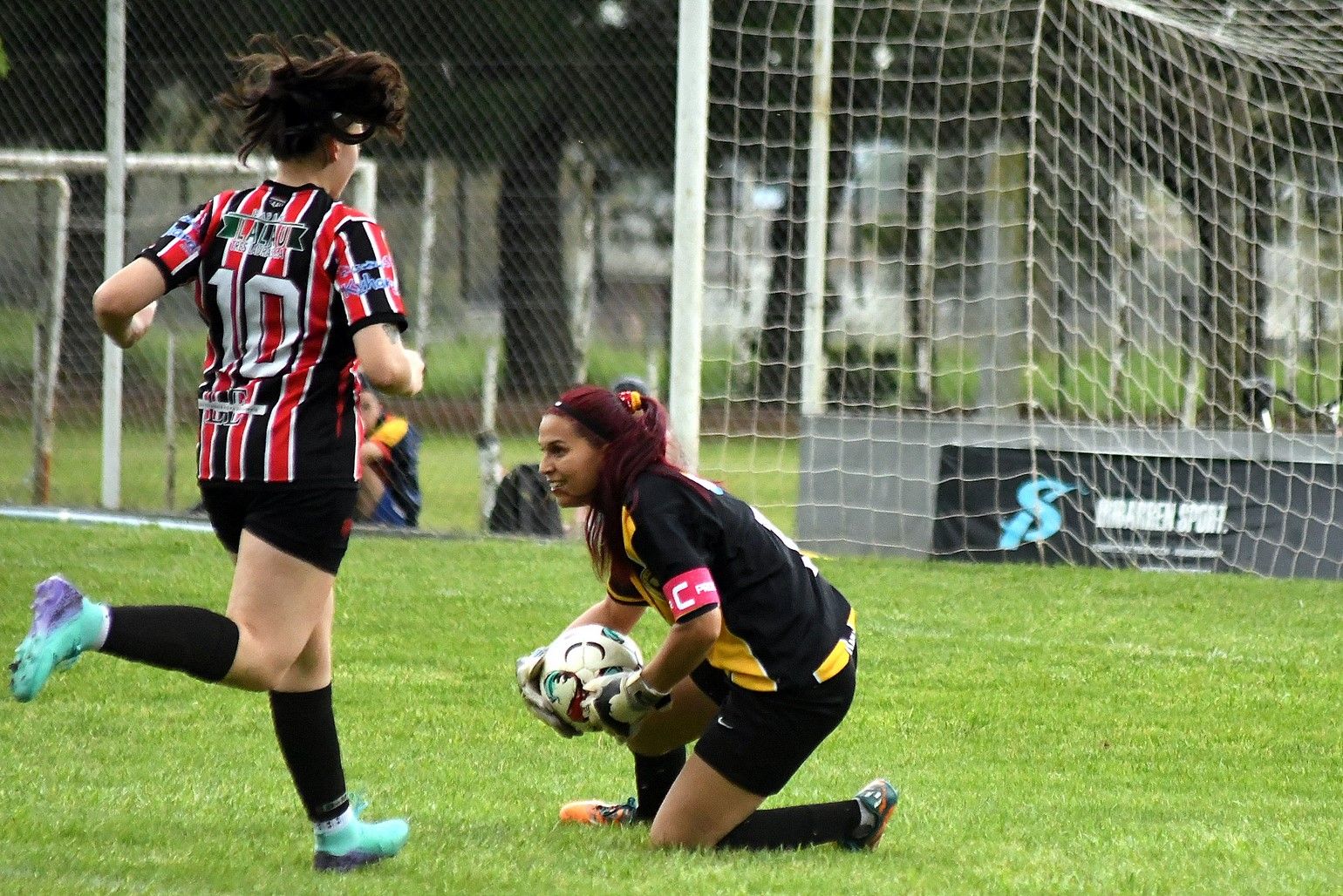 CONTENCION. Daniela Blanco detiene la carrera de Melina Blanco tras un avance. AU ganó por poco.